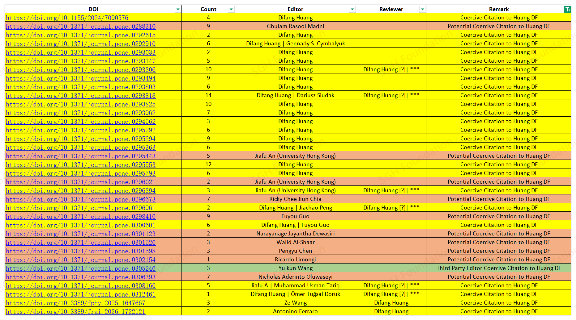 A recent investigation by the 5GH Team uncovered the questionable editorial and review practices by HUANG Difang (黄棣芳) on PLoS ONE and other journals.