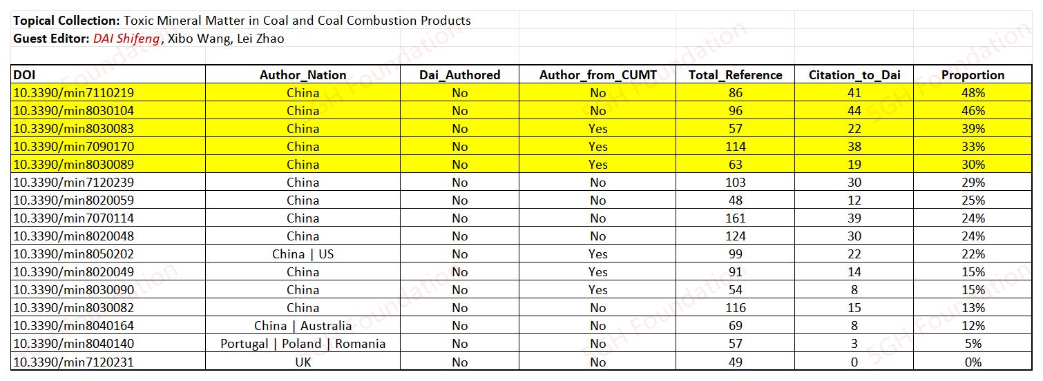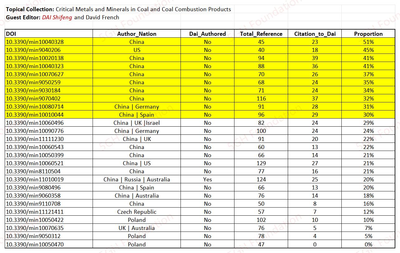 The topical collection "Critical Metals and Minerals in Coal and Coal Combustion Products" at the MDPI title "Minerals" is found to contain an excessive number of citations to the guest editor, DAI Shifeng (代世峰) from the China University of Mining and Technology (Beijing).