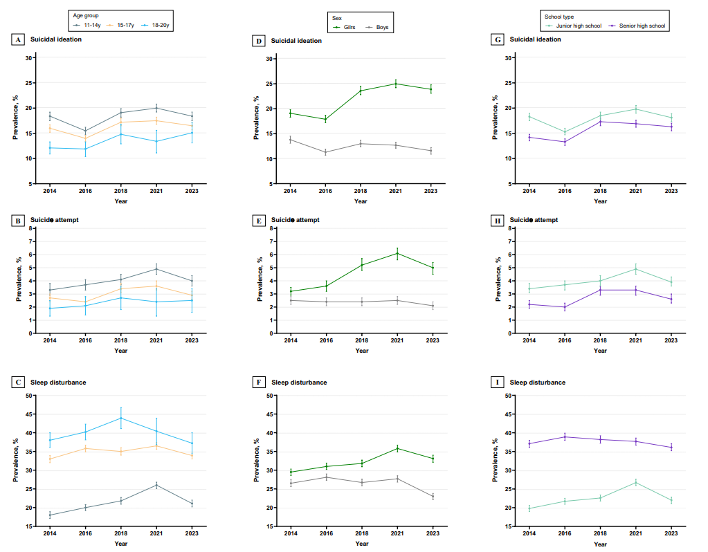 一项在广东开展的青少年健康调查(School-based Chinese Adolescents Health Survey,SCAHS)显示,约有 3% 的中学生曾经自杀未遂。研究人员分析了 5 轮(分别开展于 2014 年,2016 年,2018 年,2021 年,以及 2023 年)SCAHS 数据后得到上述结论。