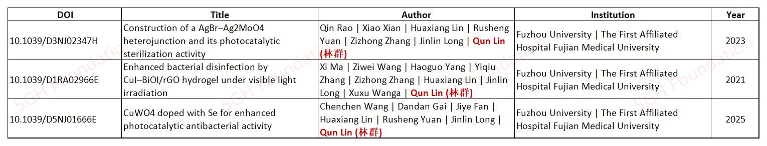 These three articles were published between 2021 and 202.5 in collaboration with a research group at Fuzhou University, with LONG Jinlin appearing as one of the core authors. LIN Qun is the only author affiliated with the First Affiliated Hospital of Fujian Medical University. According to publicly available information, LIN received his medical doctor degree in 2005. During the same period (2021–202.5), LIN also published several articles in medical research fields. These facts collectively suggest that LIN lacks a background in materials science, and his inclusion as an author on those three materials science articles may be a case of gifted authorship.