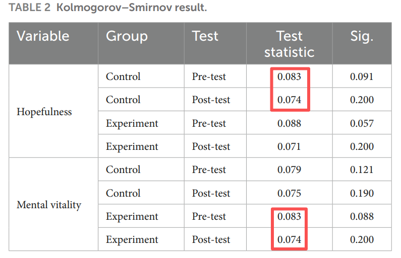 In Table 2 of this article [1], the "Test statistic" values for the "Control" group in the "Hopefulness" measurement are exact the same as those for the "Experiment" group in the "Mental Vitality measurement, suggesting those values may be incorrect.